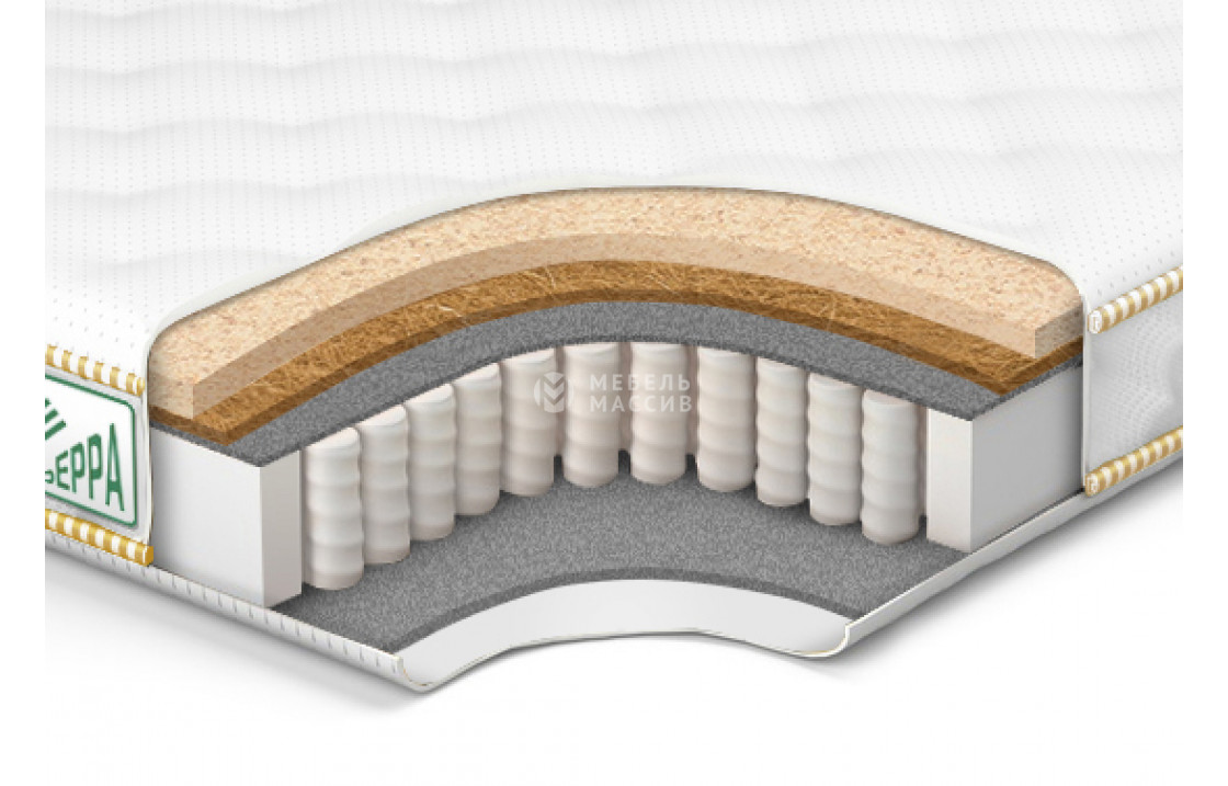 Кокос - переплетенные волокна кокосового ореха, растительного происхождения. Исключительные свойства кокоса в прочности, упругости и гигиеничности. Материал придает жесткости матрасу. Обладает отличной вентилируемостью, устойчив к любой влажности и перепадам температуры, гипоаллергенный и долговечный.