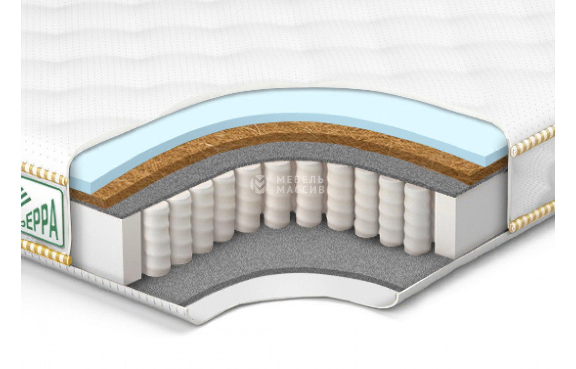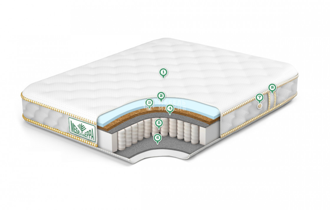6. Кокос 2 см ? Кокос - переплетенные волокна кокосового ореха, растительного происхождения. Исключительные свойства кокоса в прочности, упругости и гигиеничности. Материал придает жесткости матрасу. Обладает отличной вентилируемостью, устойчив к любой влажности и перепадам температуры, гипоаллергенный и долговечный.